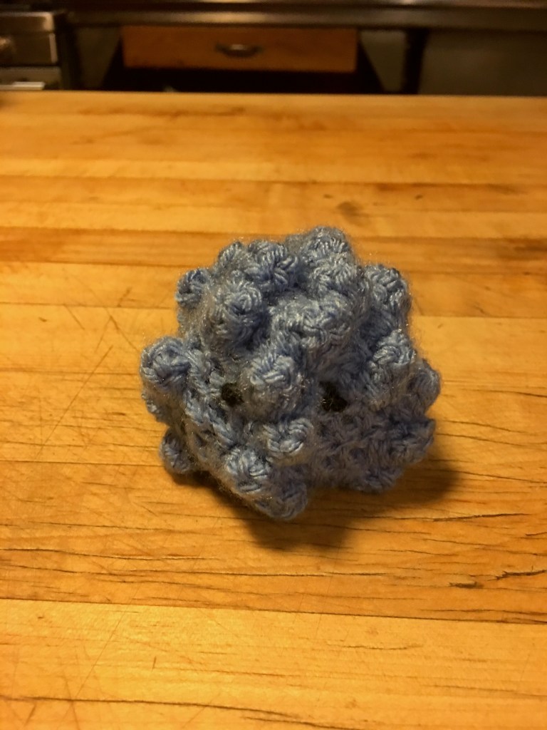 Below is my interpretation of Amigurumi Rhinovirus, otherwise known as the common cold. Though not deadly this problem has been with humanity since the beginning of recorded history and is the most common infection. It can lead to sever complications such as otitis media and other long term consequences. In particular for those who lack proper health care and resources.