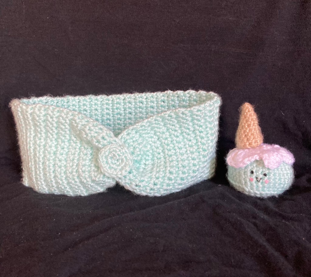 I love that mint colored yarn and so I just kept going and created an ear warmer. Pretty simple pattern and worked up very fast. Welcome any comments, questions or suggestions. I won’t wait so long to post up my amigurumi joy and adventures from here on out. (Funny that the black background makes that whip cream look pink rather than white, still super fun and super kawaii!)