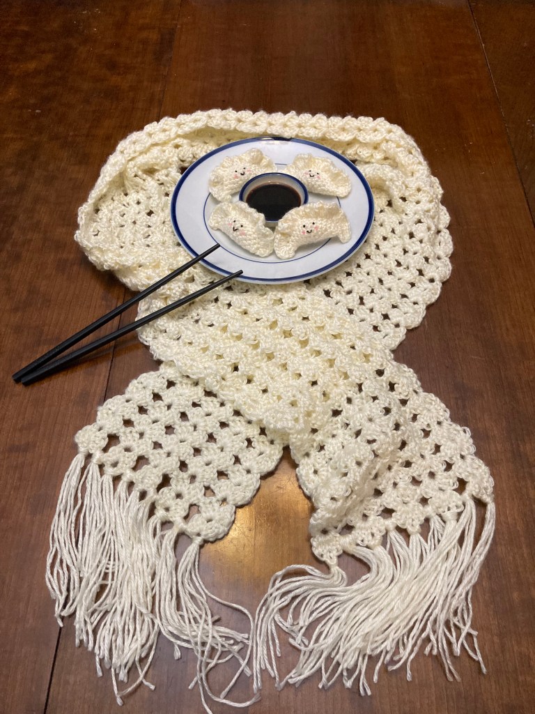 The Amigurumi Dumplings were actually inspired when I finished this scarf. The color of the yarn spoke to me for the color of the dumplings. Also the double crochet stitch made multiple times in a single spot creates the ruffle edge on the dumplings. While 3 double crochet stitches, 2 chain stitiches , then 3 more double crochets is what creates a lace-like pattern in the scarf. Not as hard as it sounds for the scarf and I am already started on my holiday gifts.